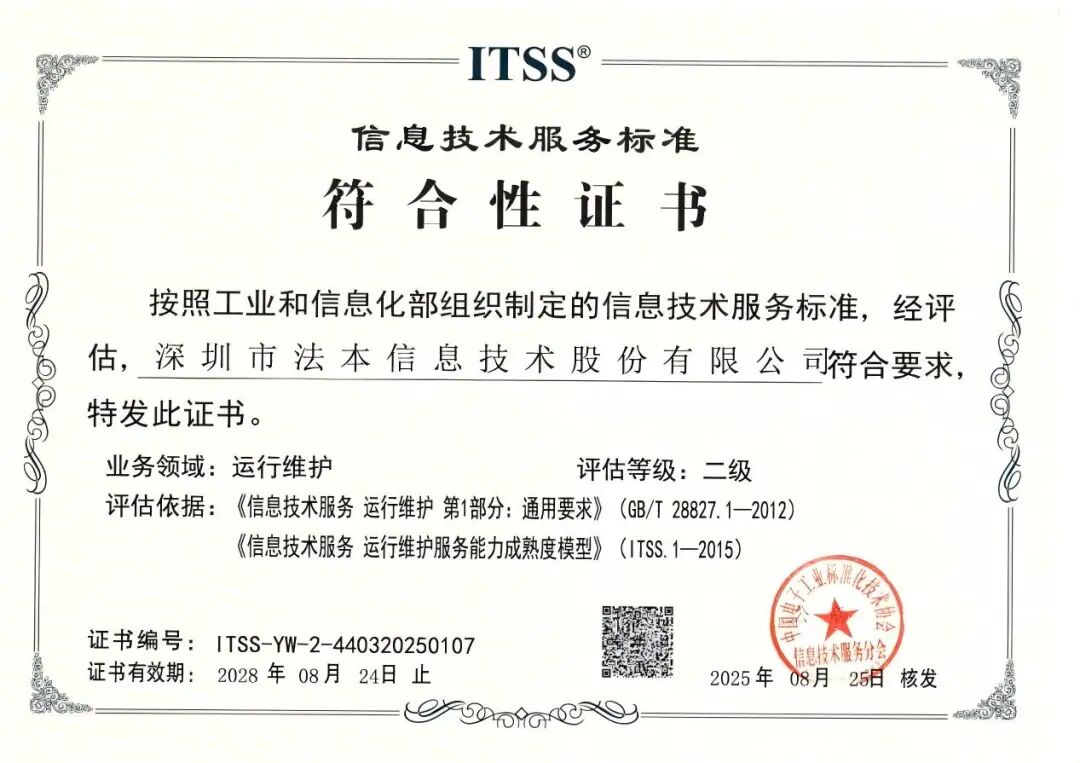 面对激烈竞争与高难度挑战,法本信息凭借扎实的运维体系建设、丰富的项目经验以及专业的团队表现成功突围,斩获 ITSS 二级认证证书。